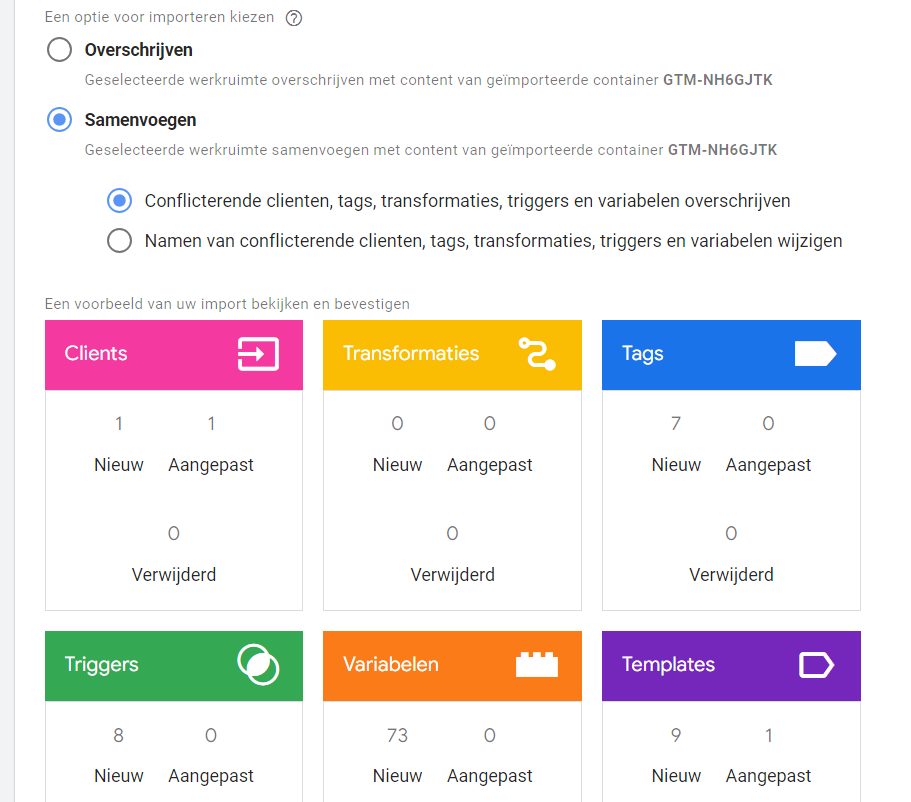 Selecteer daarna of je de import je Tag Manager onderdelen over wil laten schrijven of samen wil laten voegen. Als je (vrijwel) niks in je servercontainer hebt staan, kies je voor 'overschrijven'. Anders kies je voor 'Samenvoegen' en dan kies je voor 'Namen van conflicterende clienten, tags, transformaties, triggers en variabelen wijzigen'.